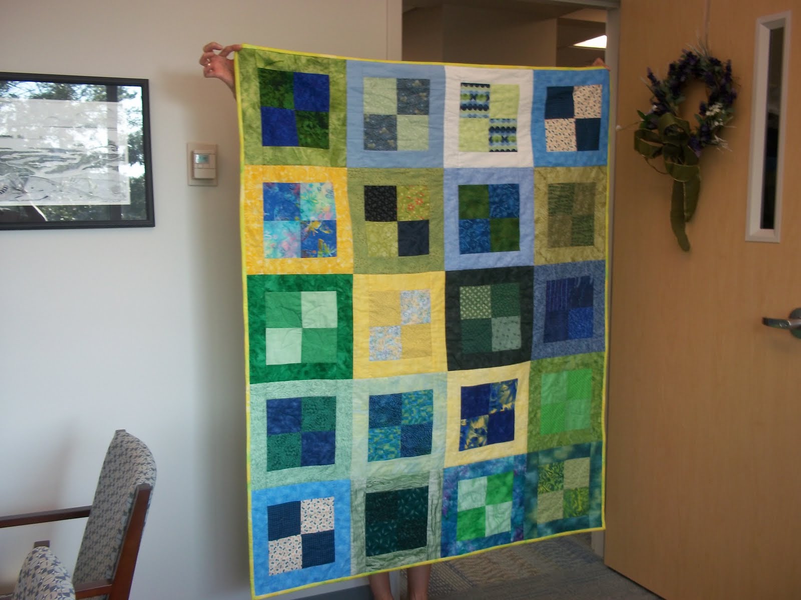 My blocks are pictured below before I sent them to Sandra in Mississippi to assemble, quilt and bind. a BIG thank you goes out to Sandra for assembling everyone's get well blocks into a beautiful quilt! Cathy McG's favorite colors are vibrant blues and greens, so I hope she enjoys her "We Care" quilt. :)